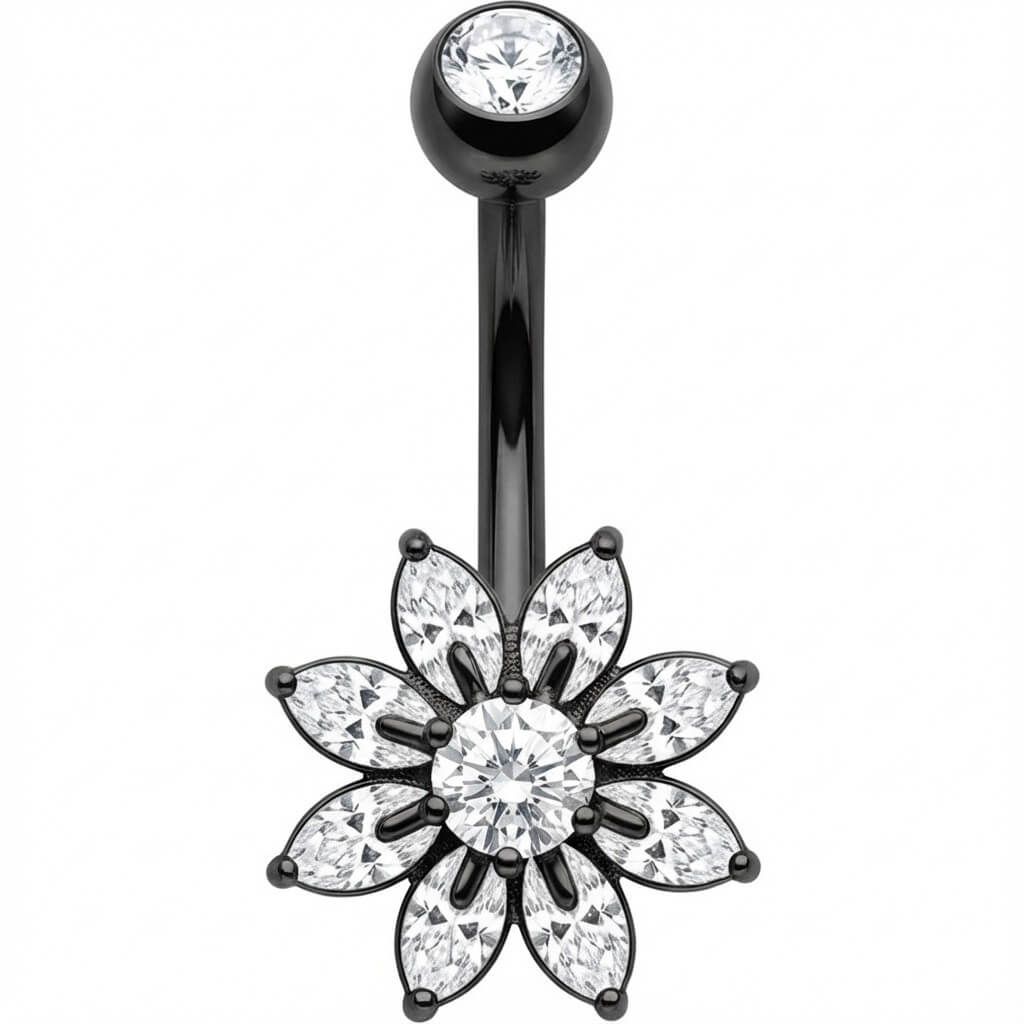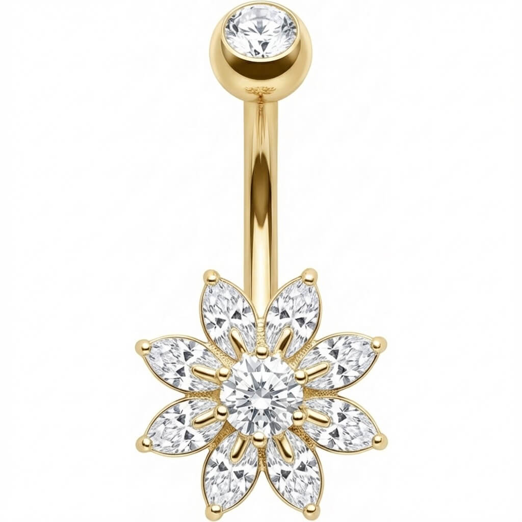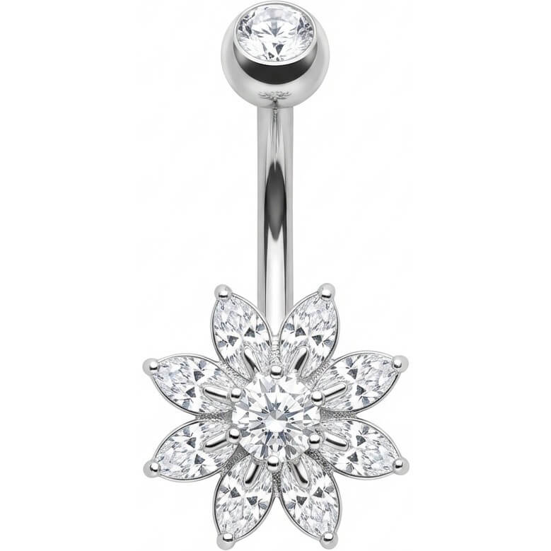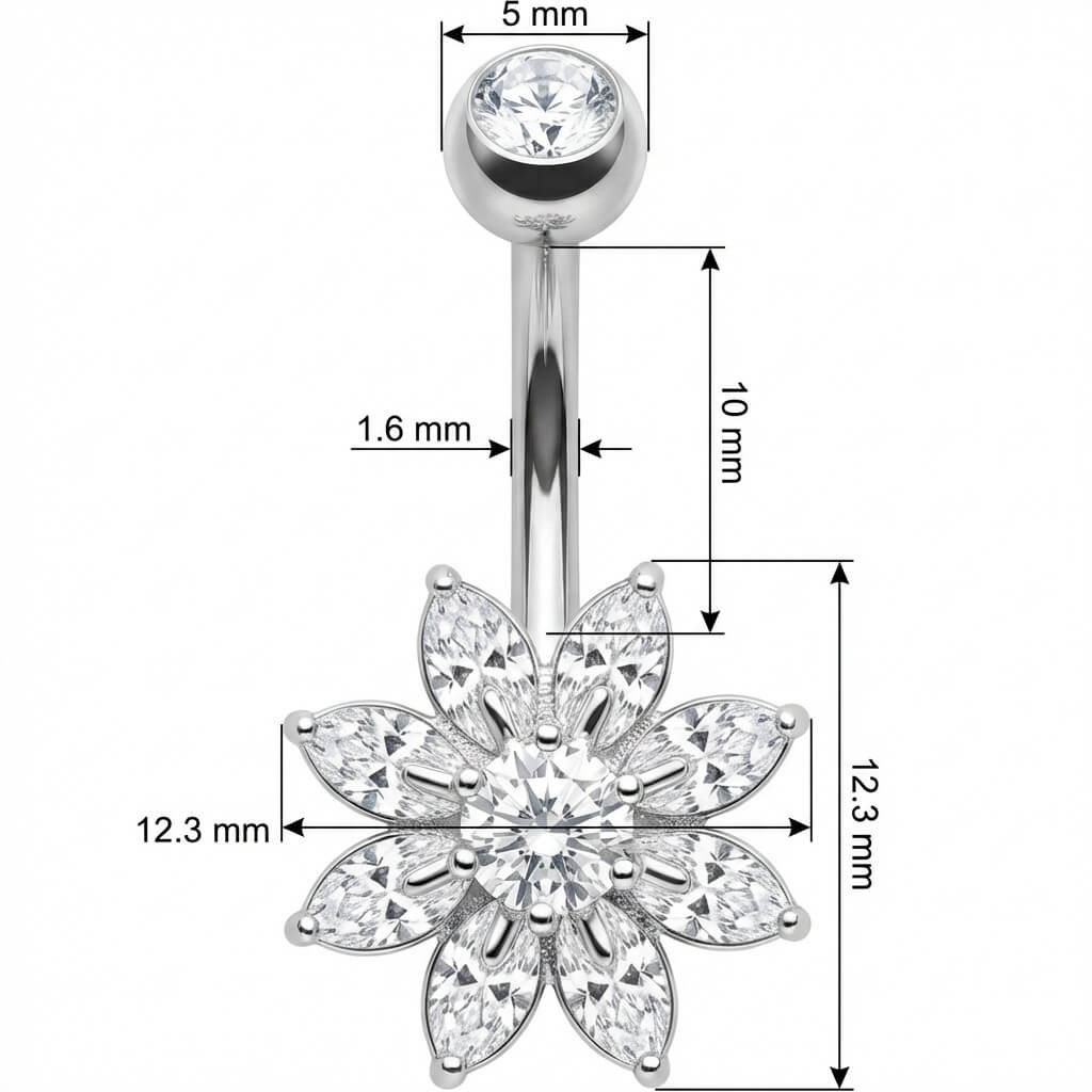 Vuoi brillare come non mai? Questo splendido fiore con cristalli taglio marquise è il dettaglio sexy perfetto per la tua estate. Realizzato in acciaio chirurgico 316L resistente e sicuro, regala al tuo ombelico una luce incredibile. Un vero eye-catcher che non passerà inosservato sotto il sole!