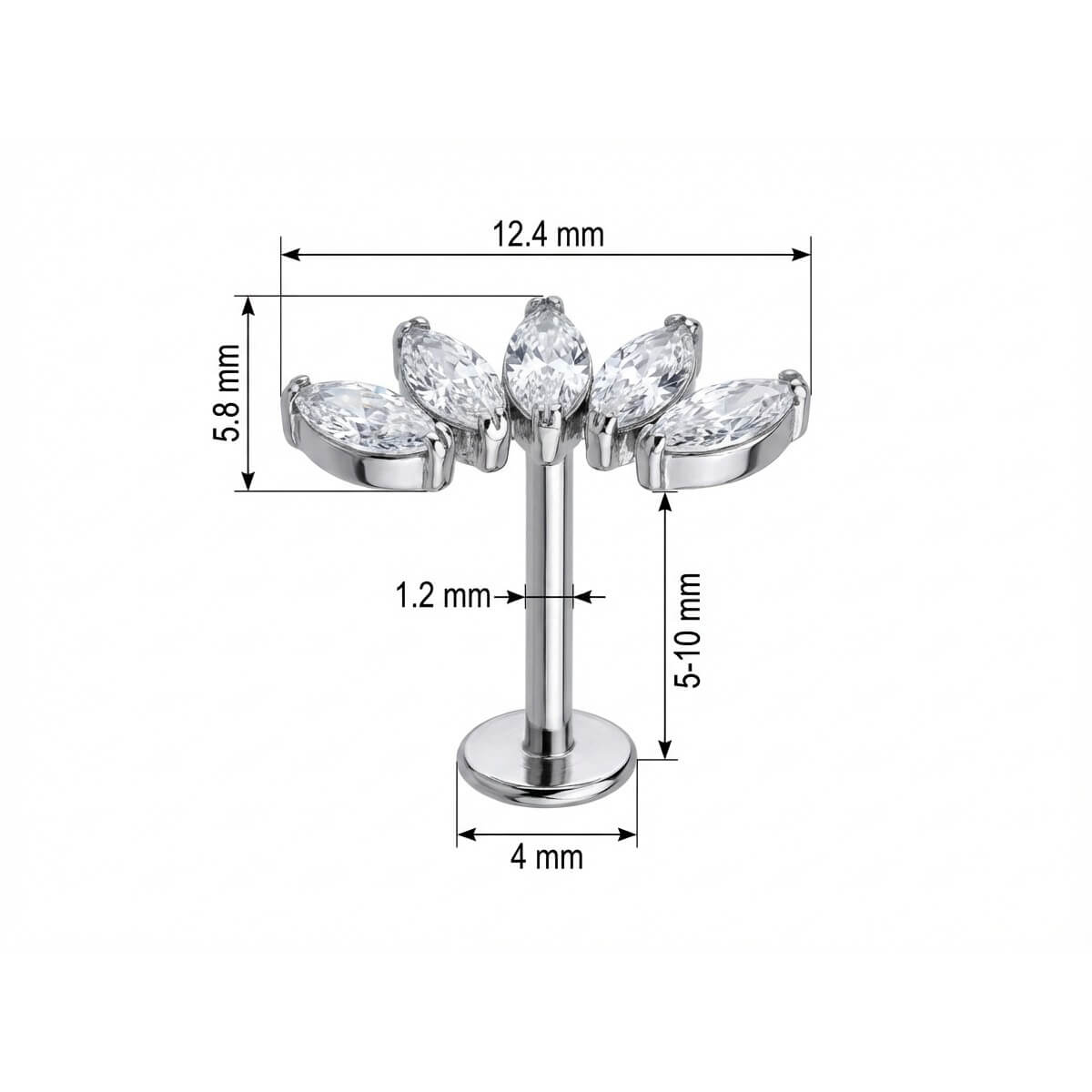 Dai una svolta al tuo look con questo design scintillante. Caratterizzato da cinque pietre taglio marquise che seguono la curva dell'orecchio, è l'accessorio perfetto per brillare ogni giorno. Realizzato in Titanio di alta qualità, è sicuro sulla pelle e super resistente. Ideale per Helix o Conch, per un tocco di luce irresistibile.