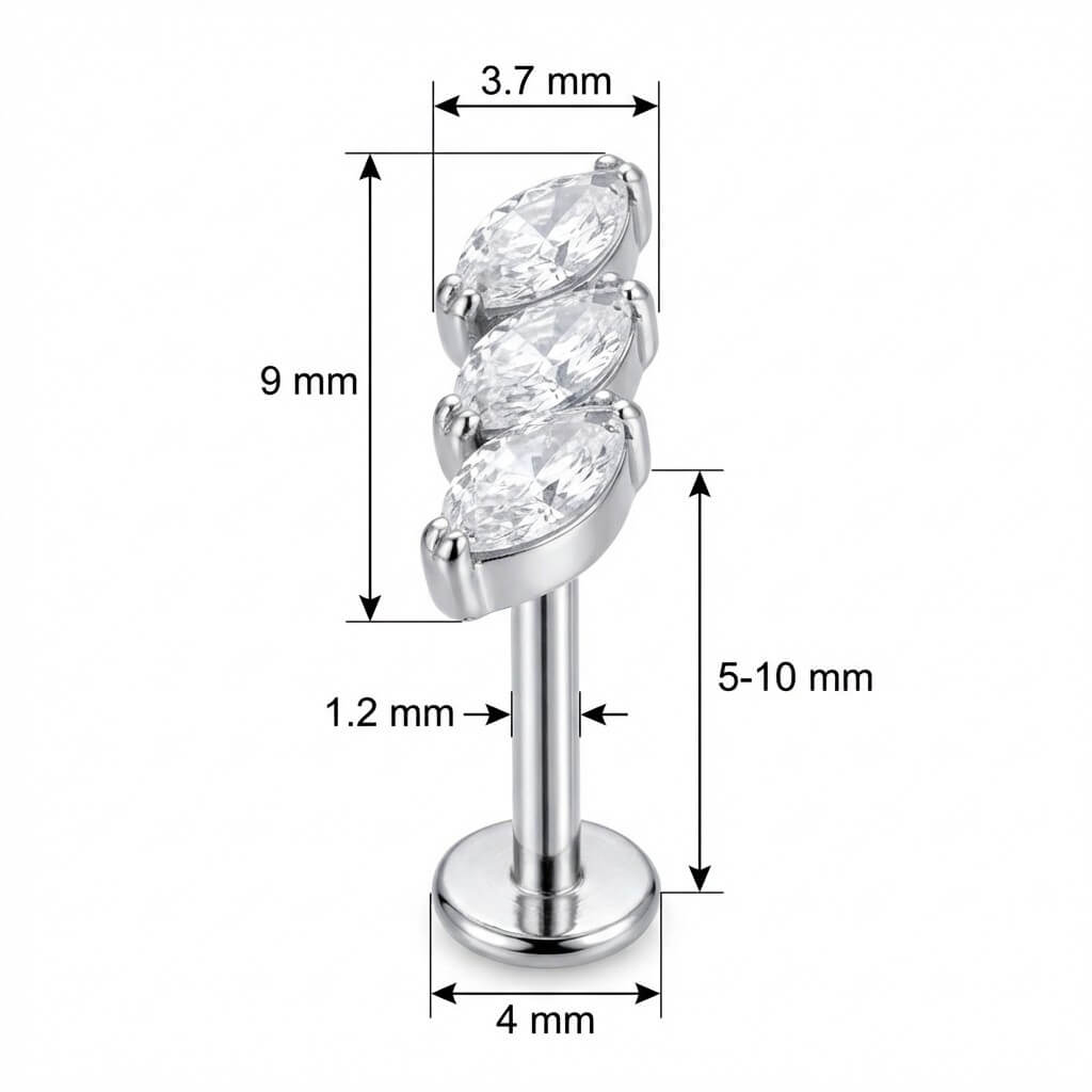 Illumina il tuo ear stack con questo splendido arco di tre cristalli taglio marquise. Con la sua forma delicata che ricorda una foglia, aggiunge un tocco di luce incredibile al tuo look. Realizzato in Titanio di alta qualità, è sicuro sulla pelle e resistente. Perfetto per valorizzare il tuo helix, conch o il lobo.