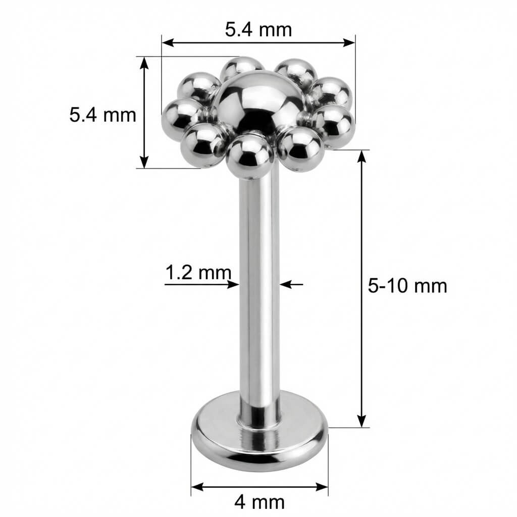 Fai sbocciare il tuo look con questo design floreale super carino. La cupola centrale circondata da piccole sfere crea un gioco di luci fantastico e aggiunge carattere al tuo stile. Realizzato in Titanio di alta qualità, è sicuro sulla pelle, ipoallergenico e resistentissimo. Perfetto per dare un tocco in più al tuo helix, tragus o alla tua collezione di lobi!