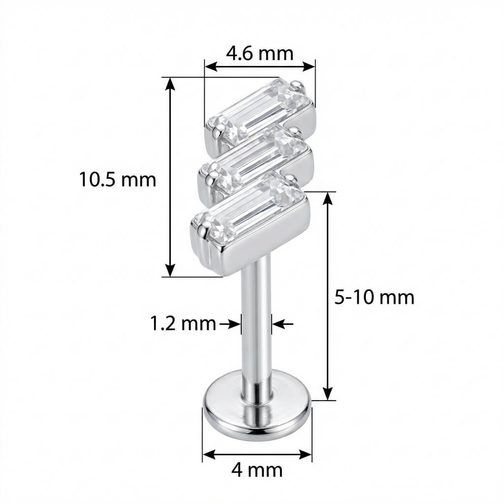 Dai un tocco di luce geometrica al tuo look. Questo design presenta tre cristalli taglio baguette disposti in una moderna forma a gradini diagonali che non passa inosservata. Realizzato in titanio resistente e ipoallergenico, è perfetto per essere indossato tutti i giorni. Ideale per aggiungere un dettaglio scintillante al tuo ear stack.