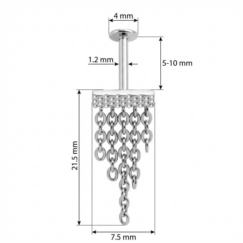 Dai un tocco di dinamismo al tuo look. Questo gioiello presenta una barretta dalla superficie lavorata da cui scendono diverse catenine fini, creando un elegante effetto a cascata. Realizzato in Titanio di alta qualità, garantisce sicurezza e comfort per la tua pelle. È il dettaglio perfetto per rendere unico il tuo piercing all'helix o al lobo con uno stile inconfondibile.