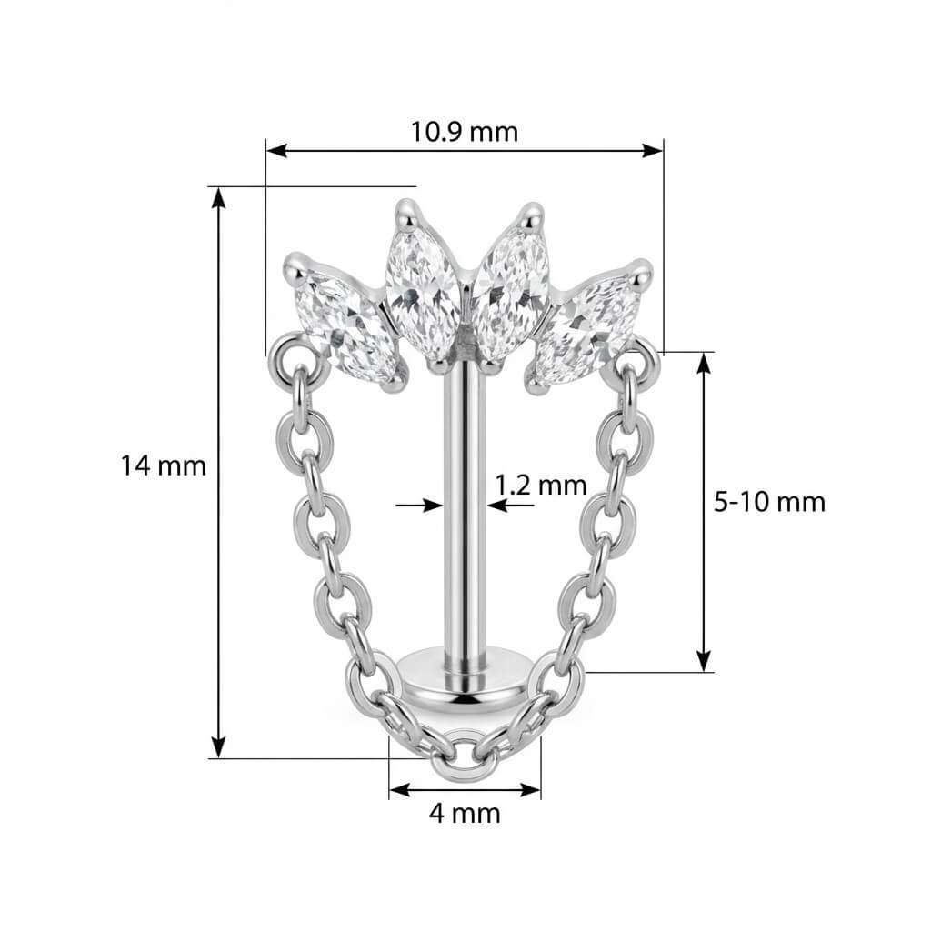 Dai una marcia in più al tuo look con questo design unico. Un arco di quattro pietre taglio marquise si unisce a una delicata catenina morbida per creare un effetto di luce e movimento spettacolare. Realizzato in Titanio, è sicuro sulla pelle e costruito per durare. Il dettaglio perfetto per rendere il tuo ear stack davvero indimenticabile.