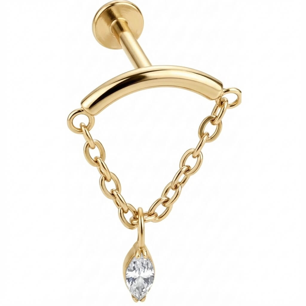 Aggiungi un tocco di luce e movimento al tuo ear party. Questo gioiello presenta una barretta curva che segue l'anatomia dell'orecchio, da cui scende una delicata catenina adornata da un cristallo taglio marquise centrale. Realizzato in Titanio ipoallergenico, ti garantisce stile e sicurezza totale per la pelle. Perfetto per chi cerca un dettaglio che non passi inosservato e brilli ad ogni movimento.