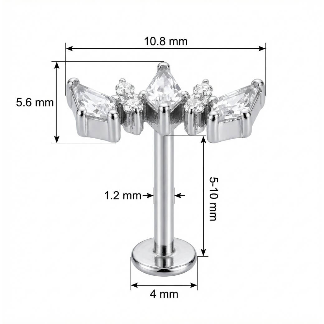 Dai luce al tuo ear party! Questo splendido design presenta tre cristalli a forma di rombo alternati a piccoli punti luce rotondi. Realizzato in titanio di alta qualità, è sicuro sulla pelle, ipoallergenico e super resistente. Il dettaglio perfetto per impreziosire il tuo helix o conch.