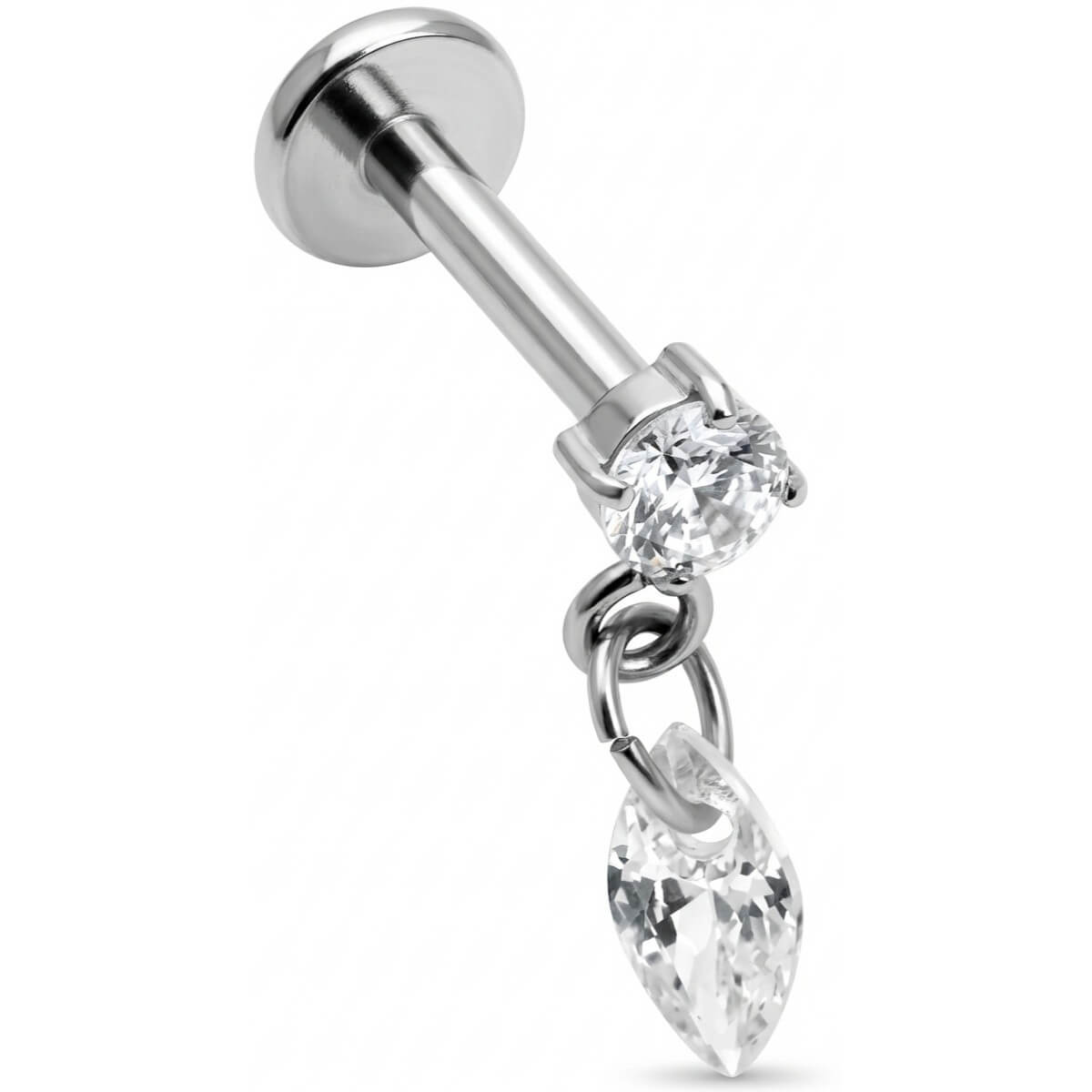 Dai luce al tuo stile con questo gioiello unico. Un cristallo rotondo luminoso si unisce a un elegante pendente taglio marquise per un effetto dinamico e raffinato. Realizzato in Titanio di alta qualità, è sicuro sulla pelle e perfetto per essere indossato tutti i giorni. Un must-have assoluto per impreziosire il tuo helix o il lobo.