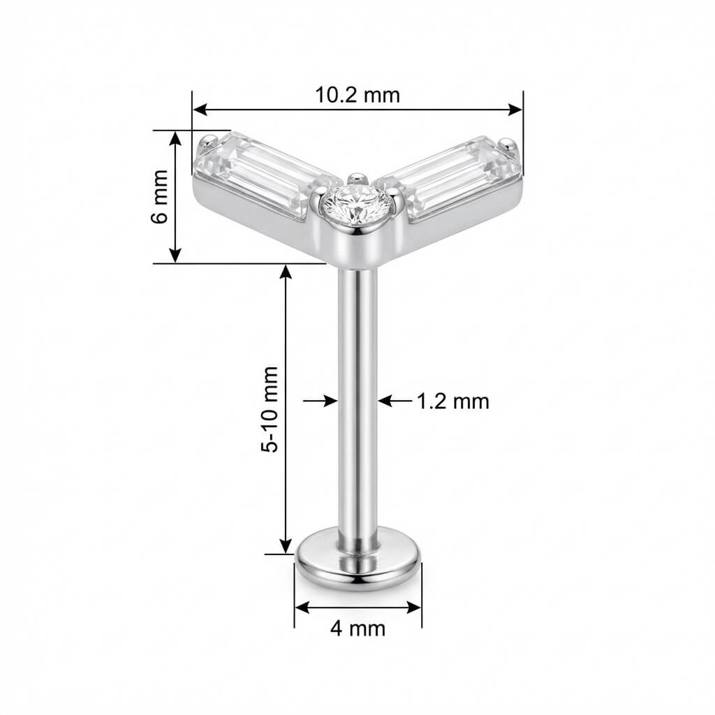 Rinnova il tuo ear stack con questo design a V super chic. Le pietre taglio baguette si uniscono a un cristallo rotondo centrale per una brillantezza unica. Realizzato in Titanio premium, è sicuro anche per le pelli più sensibili. Perfetto per helix, conch o lobo.