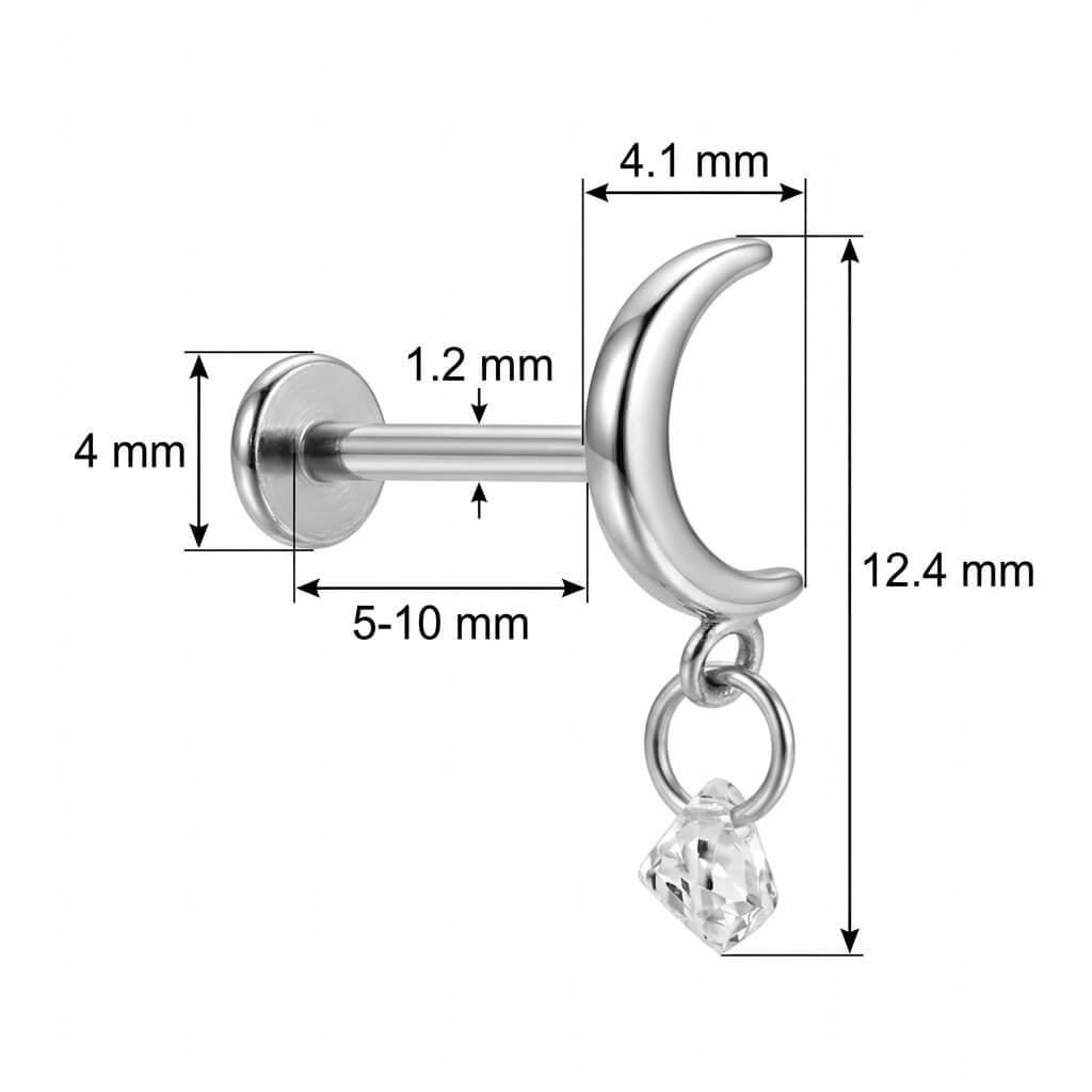 Porta un tocco di magia lunare sempre con te. Questa mezzaluna presenta un cristallo pendente che cattura la luce ad ogni tuo movimento, creando un effetto super luminoso. Realizzato in Titanio di alta qualità, è sicuro sulla pelle e resistente all'acqua. Il dettaglio perfetto per dare carattere al tuo helix o al lobo.