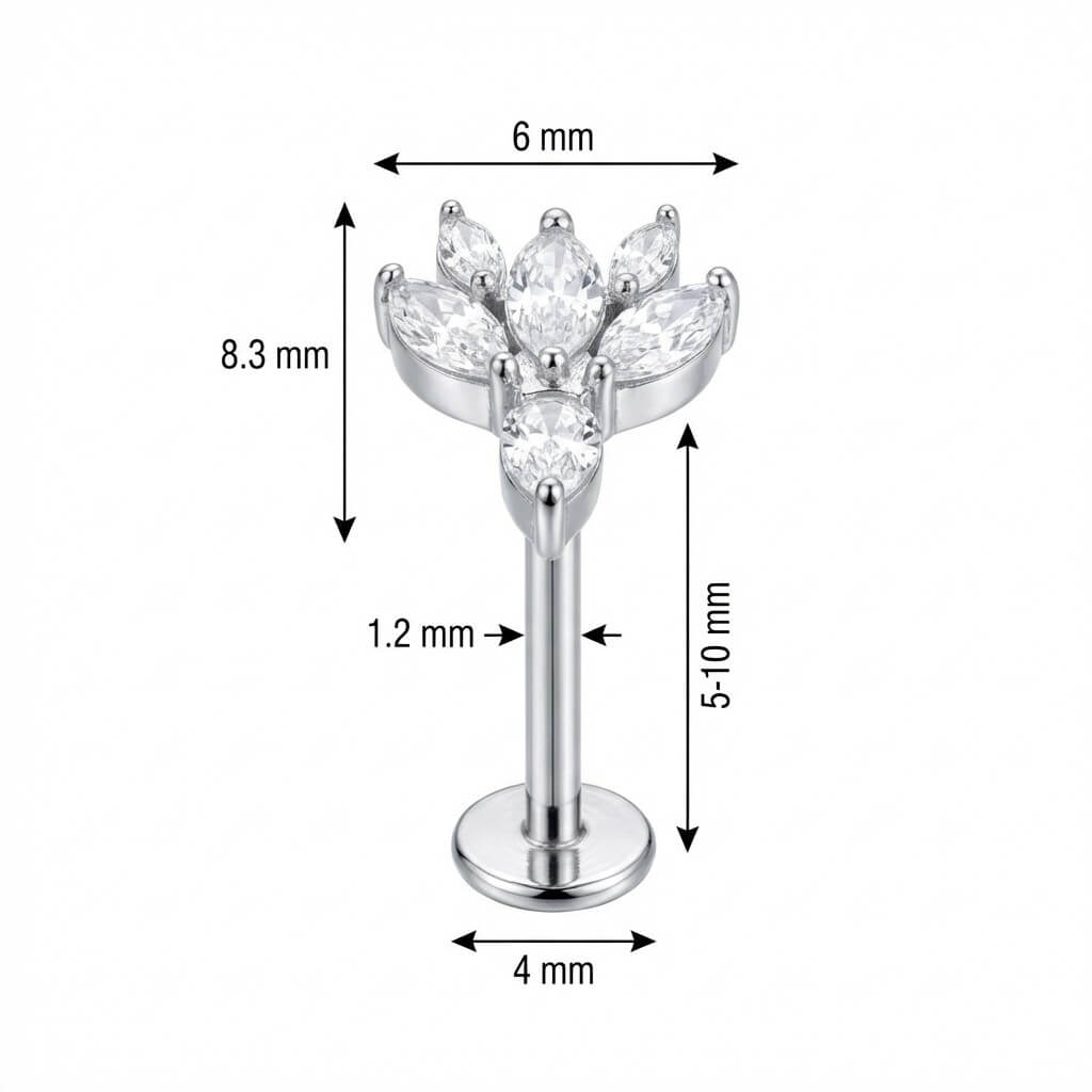 Fai sbocciare il tuo look! Questo splendido design a forma di loto con cristalli taglio marquise è pura luce. Realizzato in titanio di alta qualità, è super delicato sulla pelle e resistente nel tempo. Perfetto per dare un tocco glamour e raffinato al tuo helix, conch o lobo. Non potrai più farne a meno.