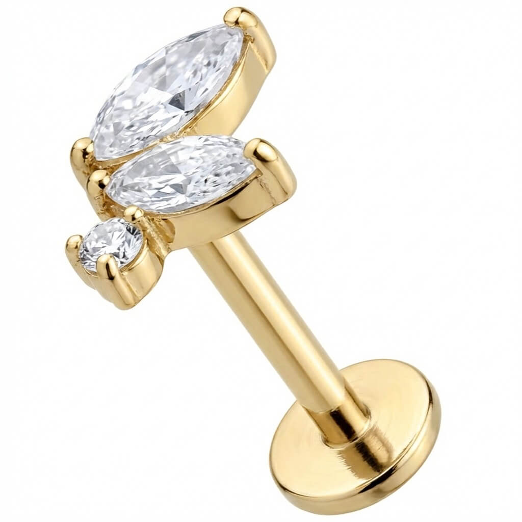 Dai un tocco di luce al tuo orecchio con questo design unico. Composto da due cristalli taglio marquise e un punto luce rotondo, crea un delicato motivo a foglia che non passa inosservato. Realizzato in Titanio di alta qualità, è sicuro sulla pelle e super resistente. Ideale per arricchire il tuo helix, conch o lobo.